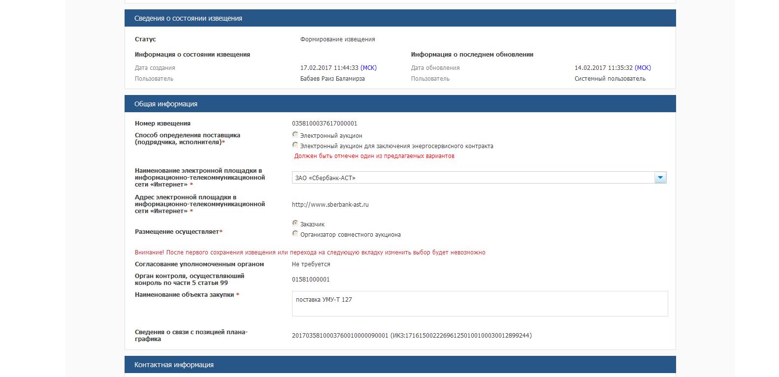 vch3701 писал(а):Дорогие коллеги, кто может подсказать. Столкнулись с следующей проблемой. При формировании извещения о проведении электронного аукциона при направлении на контроль в казначейство извещение не прошло контроль. При попытке внести изменения в проекте извещения Редактирование/удаление проекта извещения невозможно (удаление в контекстном меню отсутствует), при формировании изменения извещения активна только вкладка «Общая информация», переход на остальные вкладки недоступен. На вкладке «Общая информация» выбор в способе определения поставщика некликабелен. Обращение в службу поддержки ни к чему не привело. Прилагаю скриншоты, где наглядно видна выше описанная проблема.