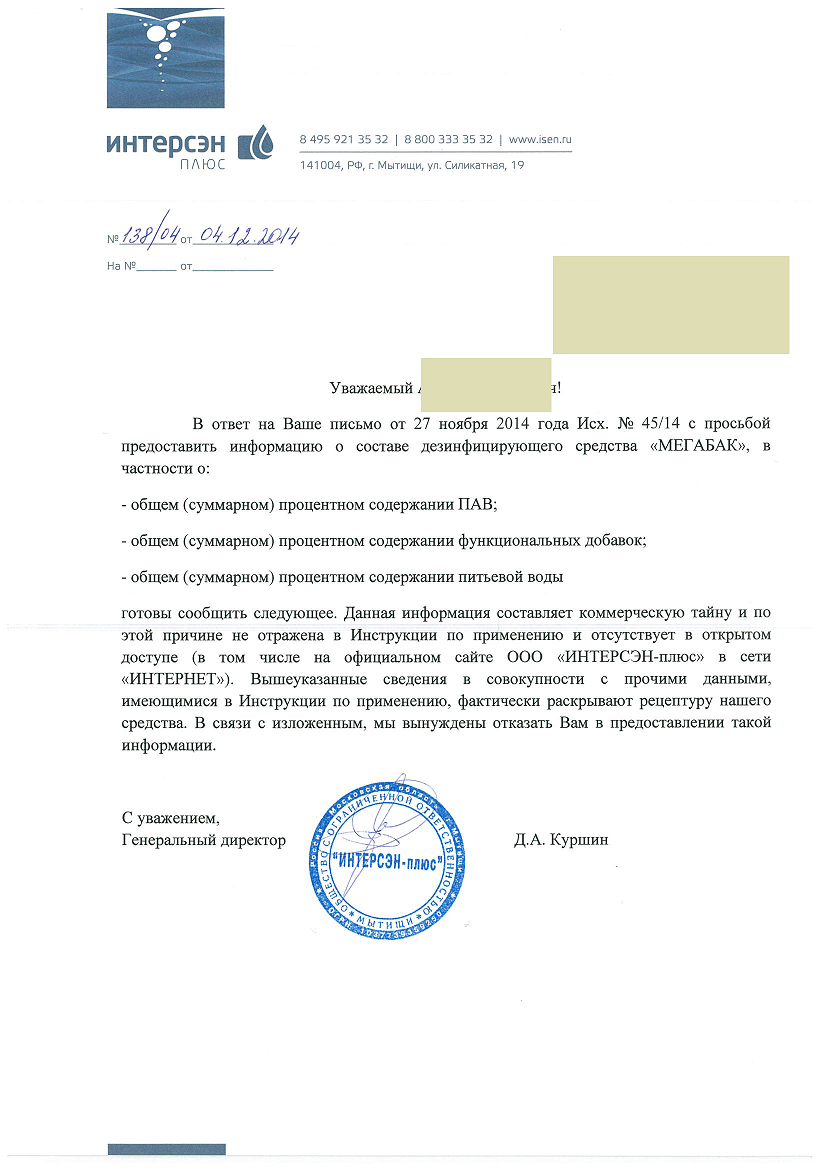 4 декабря 2014 года нами был получен ответ от производителя (прилагается), в котором указано, что данные значения средства составляют коммерческую тайну, не находятся в открытом доступе, и не могут быть отражены в Инструкции к средству, так как фактически раскрывают рецептуру средства.