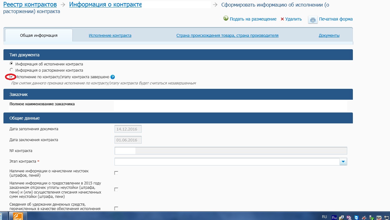 галочку нужно поставить, где исполнение по контракту завершено