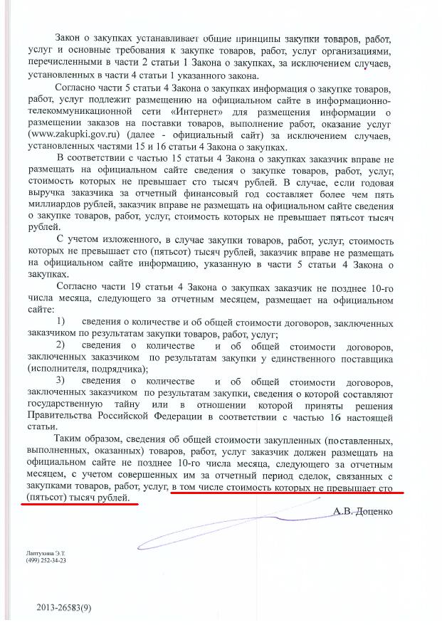Викульчик28 писал(а):я тоже считаю, что разъяснение ФАС какое-то странное. в этом документе приведены выдержки из закона, где черным по белому написано, что согласно ч.5 ст.4 заказчик ВПРАВЕ НЕ РАЗМЕЩАТЬ инфо о закупках меньше 100 тыс., и соответственно, если мыслить логично, все что далее прописывается в законе, а именно ч.19, заметьте ТОЙ ЖЕ самой статьи, касается именно инфо о договорах СВЫШЕ 100 тыс.