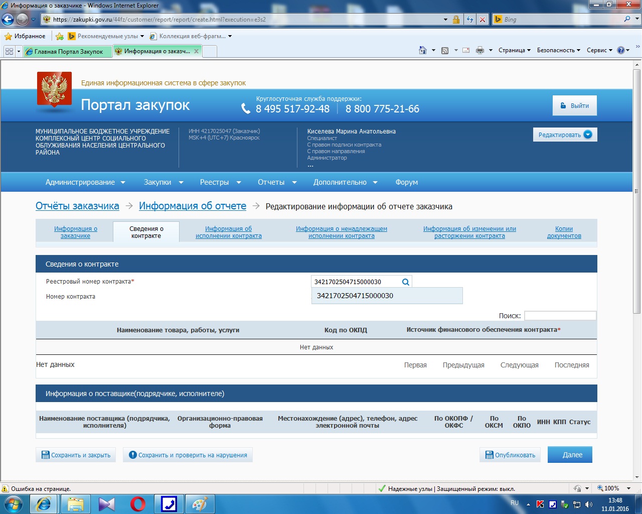 Проблема с отчётом. Пошагово. Заходим в отчёты, сначала вводим информацию о заказчике, переходим далее , сведения о контракте, вводим реестровый номер контракта 0000000000000000000090 он его находит но не нажимаеться пишет в низу браузера ошибка на странице ( так только с двумя номерами контрактов, остальные отчёты уже сделали без проблем) звонил в тех поддержку сказали сделать так и сяк но ничего не изменилось, попросили отправить им скриншоты, прислали инструкцию тоже самое в ней написано что и по телефону они мне советовали, пробовали на другом компьютере тоже самое выдаёт. Подскажите может быть кто нибудь сталкивался с этим? до тех поддержки дозвонится уже второй день опять не могу, отсылаю им письма ответа тож нет.