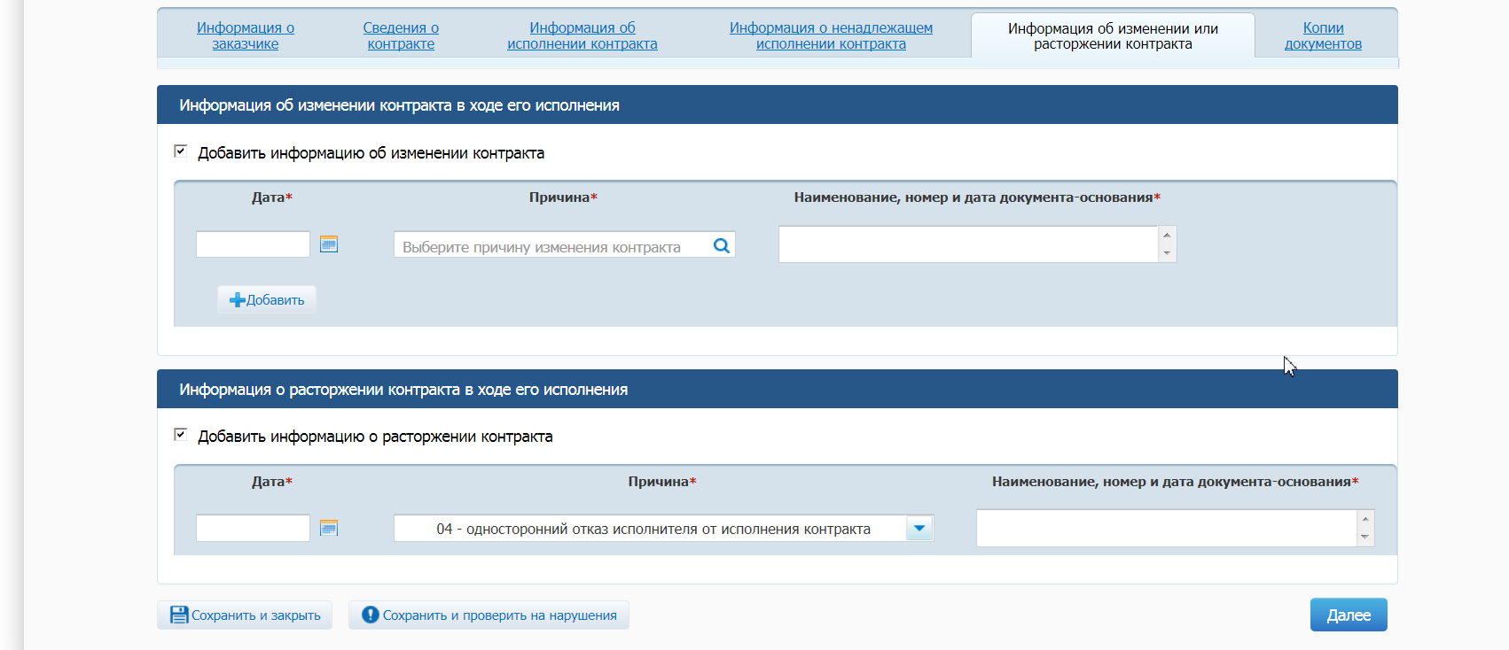 Мы ведь должны сделать обязательно отчет об исполнении контракта, разве нет? и вкладку о расторжении нужно заполнять...