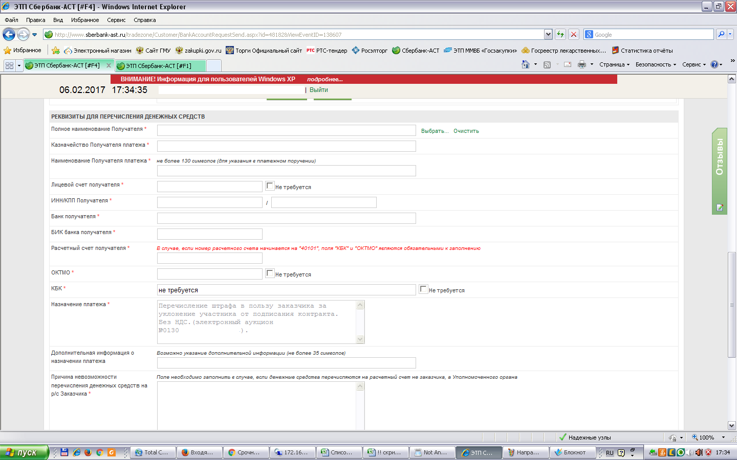 Позвонила на площадку, они разъяснили, что мы заполняем форму, указав реквизиты, куда перечислить штраф.