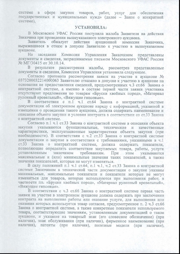 Кстати ФАС разблокировал аукцион, посчитав жалобу необоснованной. Заявитель не явился в ФАС, в решении чётко написано, что заявитель не предоставил документы на хвойные породы, рулоны кровельные, вяжущие гипсовые. Так же, в решении написано, что эти материалы используются в объекте закупки, а на самом деле в объекте закупки их нет. :ne_vi_del: