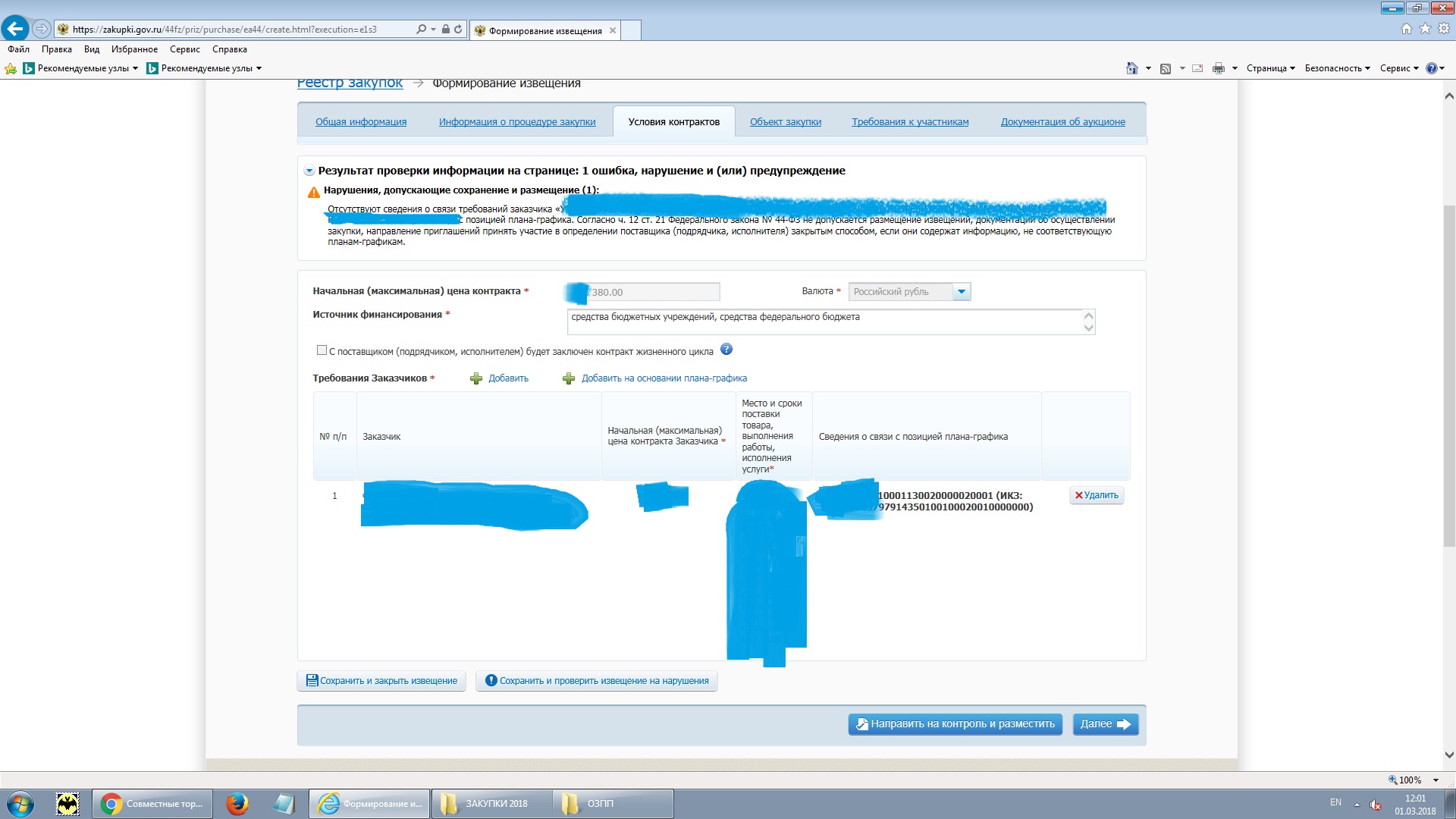ЕИС не даёт сформировать извещение, а, именно, во вкладке "Условия контрактов" при попытке обратиться к позиции плана графика второго участника ТУ, ЕИС выдаёт, что отсутствуют сведения о связи требований со вторым заказчиком (см. скрины) и он не находит позиции из плана графика ТУ (второго участника).