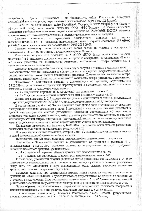 День добрый! Подскажите, пожалуйста. Участвовали в аукционе. Нас отклонили по первой части, на основании: "Несоответствие информации, предусмотренной частью 3 статьи 66 Закона № 44-ФЗ, требованиям документации об электронном аукционе.;А именно, в п.4 и п.6 заявки участника, не соответствует количество поставляемого товара, заявленному в техническом задании Заказчика". Вроде бы всё понятно: ошиблись с количеством товара. НО!!! В извещении, в документации (действующая редакция) указано количество, которое мы предложили. А в Разъяснении положений документации об электронном аукционе от 14.03.2014 №РД1 было изменено количество товаров по двум позициям. При этом и разъяснение и извещение, в которых указаны разные количества необходимых товаров в действующей редакции! Сейчас готовлю жалобу в ФАС. Подскажите, пожалуйста, на какие пункты 44-ФЗ грамотнее сослаться?