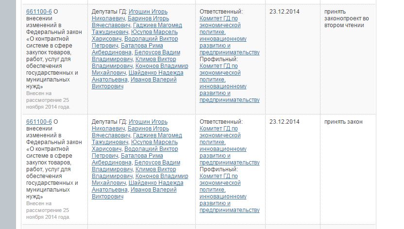 23 декабря 2014 года Государственной Думой ФС РФ принят Федеральный закон (законопроект № 661100-6), предусматривающий внесение изменений в Федеральный закон от 5 апреля 2013 года № 44-ФЗ «О контрактной системе в сфере закупок товаров, работ, услуг для обеспечения государственных и муниципальных нужд».