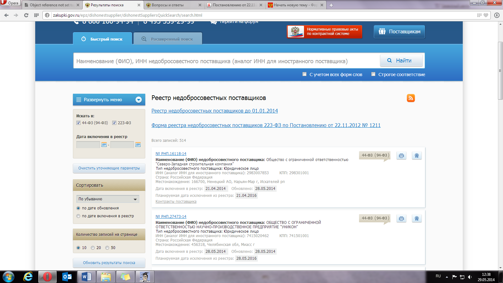 и только в реестре РНП, до 01.01.2014 можно как-то распечатать справку о том, что данный поставщик не находится в реестре (РНП, действовавший по 94фз), но и он сегодня помему-то не открывается