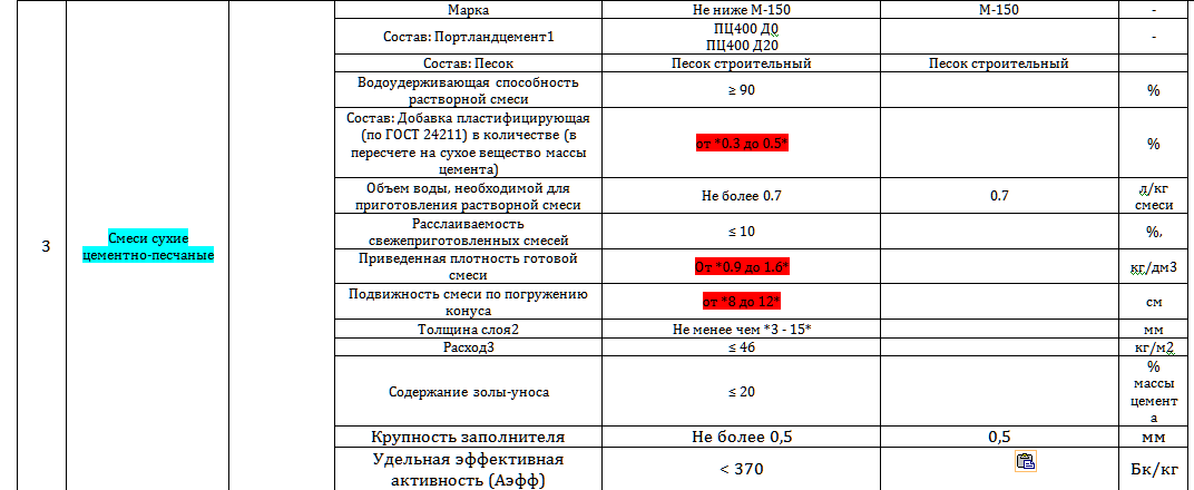 Смеси сухие цементно-песчаные: Приведенная плотность готовой смеси От *0.9 до 1.6*