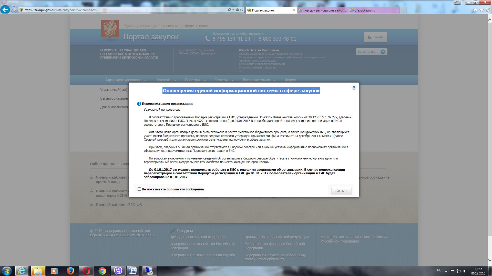 Zelogan писал(а):Зарегистрированы на ЕИС по 223ФЗ ПолучилиЭЦП в Казначействе при попытке зайти по нему в Личный кабинет 44ФЗ доходит до выбора Физическое или Юридическое лицо хочет зайти Кликаю на предприятьие и Выдает ошибку что "Не могу отобразить вэб страницу" Помогите у кого были такие проблемы. На ЕИС по 44Фз организация есть но под статусом незарегистрирована. Может ее зарегистрировать где то еще необходимо?
