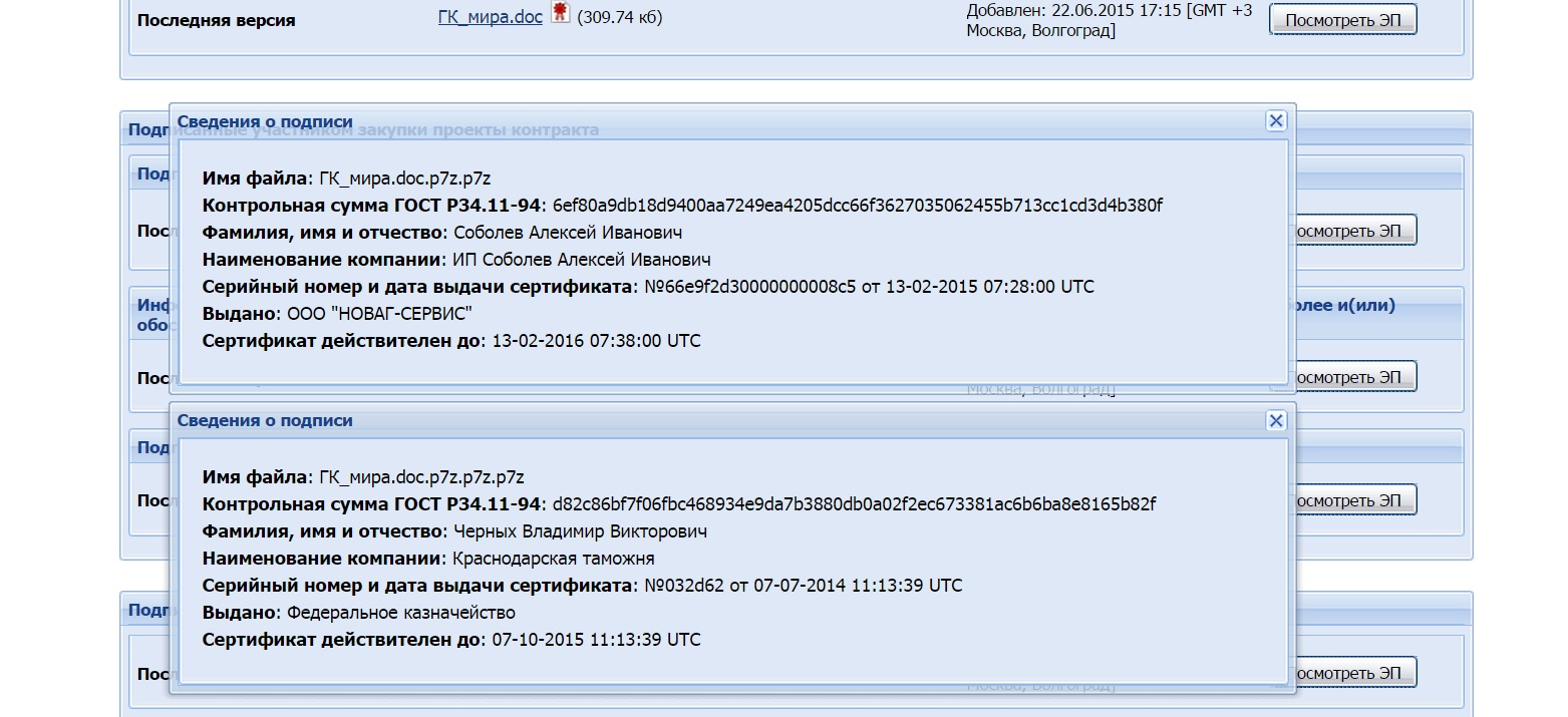 здравствуйте, как можно подтвердить что контракт подписанный по итогам проведения электронного аукциона и размещенный в реестре контрактов на ООС содержит ЭЦП заказчика и поставщика. В проге арм ртс-тендер есть такой функционал а вот на ООС не могу найти. Либо мой ворд 2003 не отображает наличие обоих ЭЦП в самом вордовском файле либо они стираются при подписании ЭЦП заказчика при оформлении на ООС)