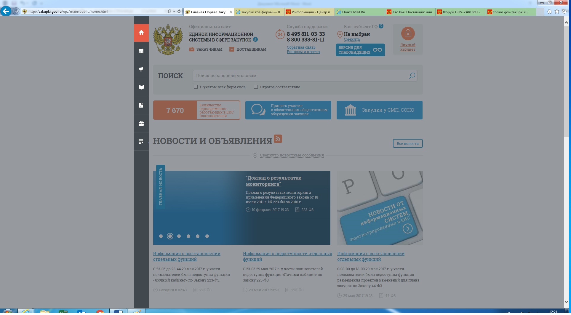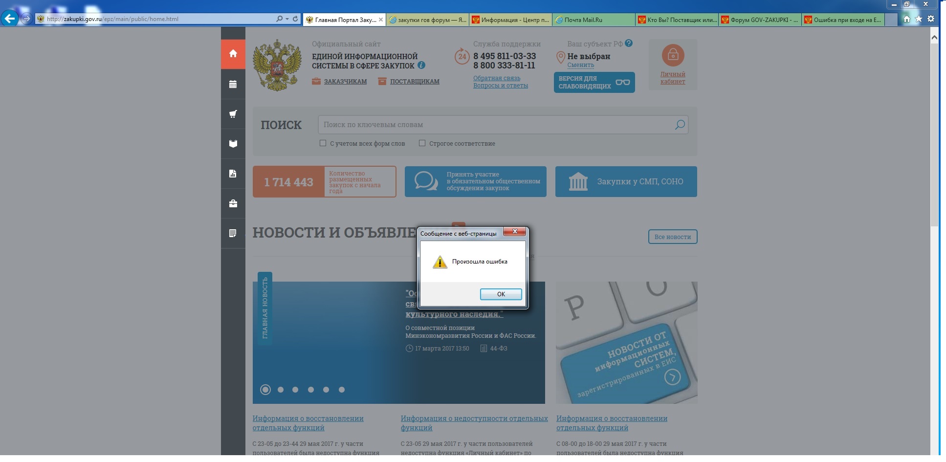 eexa писал(а):Добрый день. С сегодняшнего дня при открытии страниц ЕИС (начиная с главной, и по всем подразделам ЕИС) страница открывается либо с затемненным фоном и сообщением об ошибке (скриншот во вложении), либо просто с затемненным фоном. При нажатии на левую кнопку мыши, затемненный фон пропадает. У кого ни будь наблюдается тоже самое?