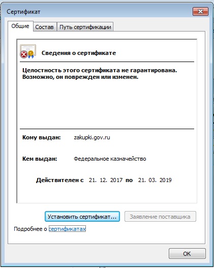 Установила первый сертификат (закупки), поместила в доверенные и ничего. В сертификатах браузера, в других польз его вижу, в доверенных нет (может он там по другому обзывается?), через импорт в доверенные пробовала, или же проблема у меня в чем-то другом...