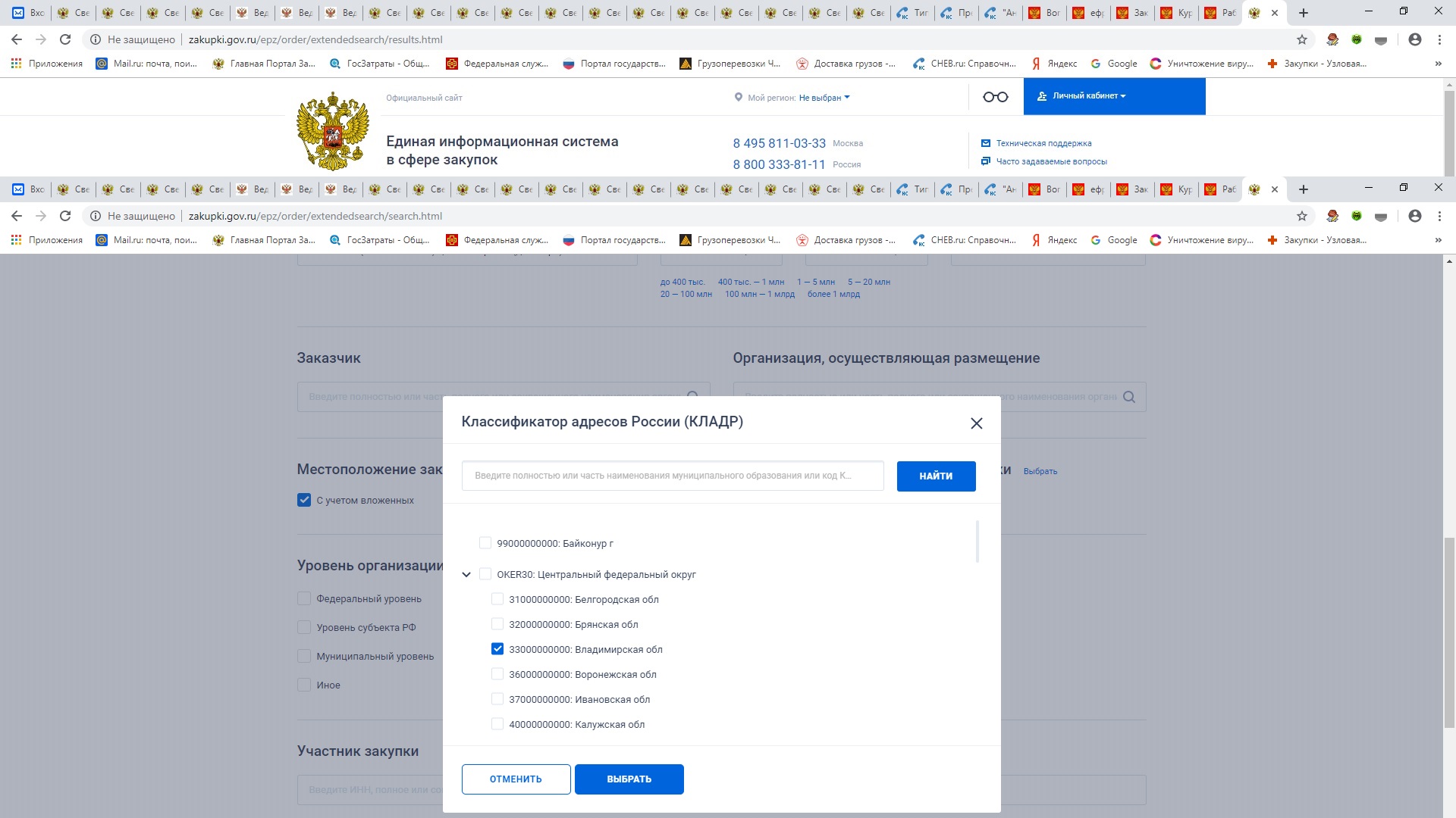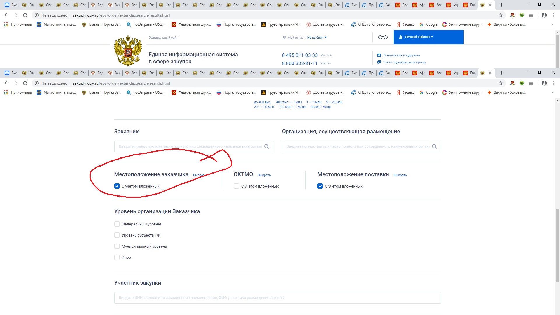 Выставляю "местоположение заказчика" и "местоположение поставки" нужную область (Нижегородская)- ощущение что выдает Приволжский регион, а не область (одна Москва почти). Если еще выбираю в ОКТМО область - дает нулевой поиск.![]()