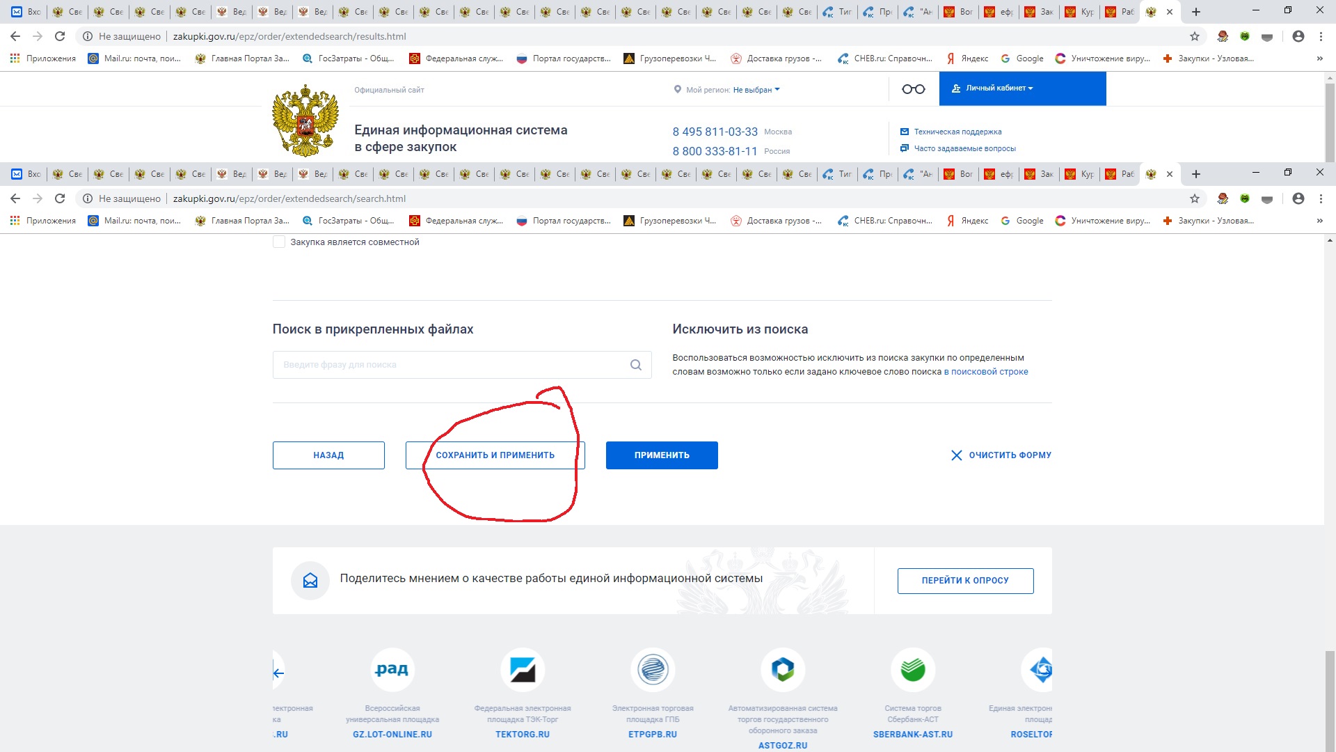 По-новой заходим на сайт, выбираем "Закупки", выбираем "Все параметры поиска", оставляем галку на нужном нам этапе закупки, "спускаемся" по странице, выбираем "местоположение Заказчика", нажимаем "сохранить и применить".