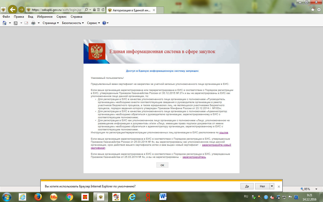 под "Администратором организации" хотела перерегистрировать пользователя - при вложении сертификата вышла ошибка: "Приложенный сертификат пользователя уже зарегистрирован в ЕИС, вы не можете зарегистрировать нового пользователя с таким же сертификатом." Решила рискнуть - удалить пользователя и зарегистрировать заново: убрала в полномочиях организации, доступные пользователю галочку, после чего пользователь удалился из списка всех пользователей организации. При регистрации этого пользователя как нового - при вложении сертификата выходит та же самая ошибка.
