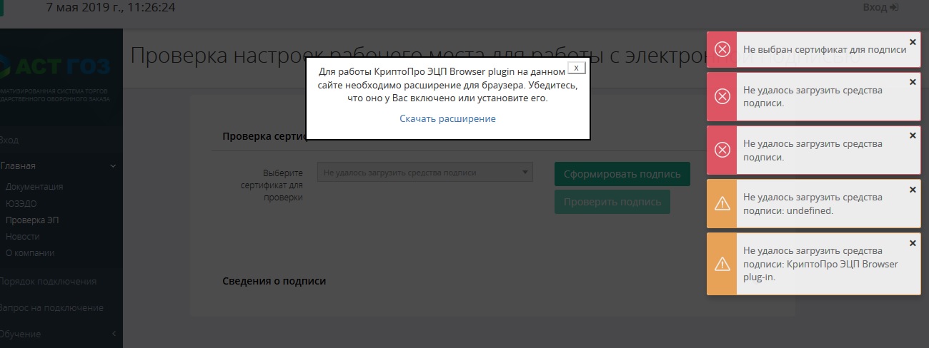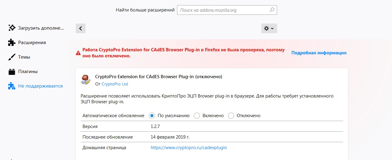 helper писал(а):Скачал расширение с сайта астгоз (также проверил ссылку с сайта криптопро) и установил в firefox.