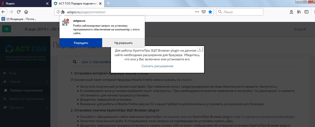 helper писал(а):Скачал расширение с сайта астгоз (также проверил ссылку с сайта криптопро) и установил в firefox.