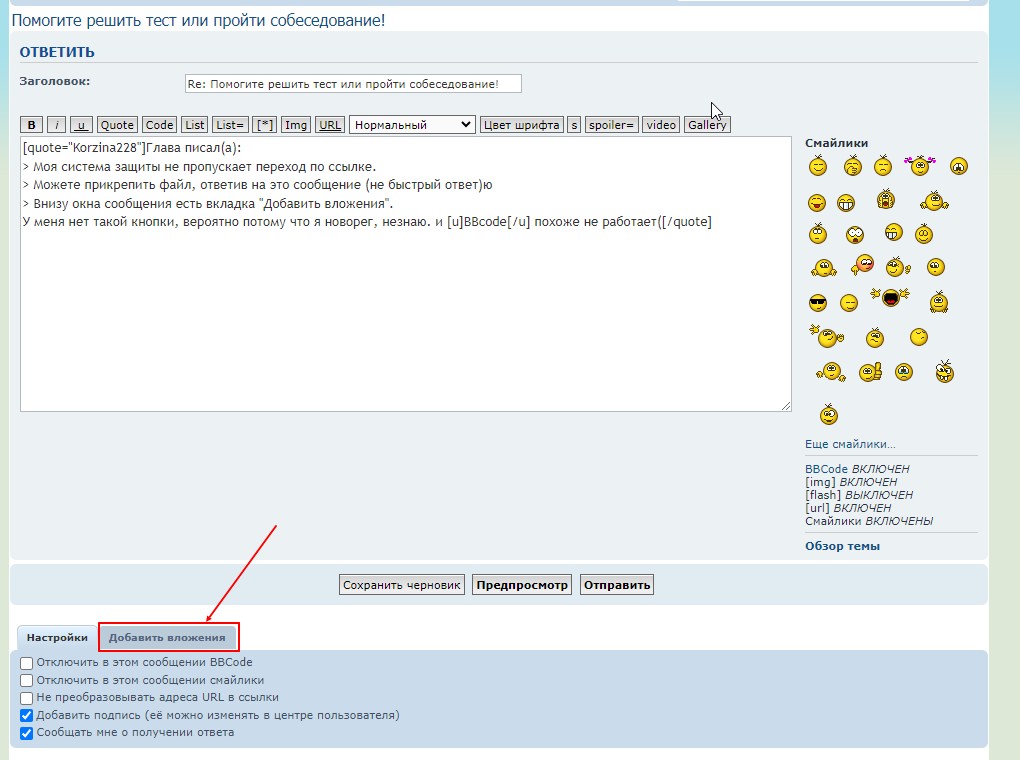 Так же ни цитировать не могу, ни использовать BBCode, судя по всему. Прочитал в факе что администратор может добавить\лишить возможности добавлять вложения.
