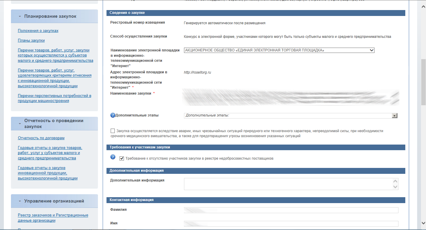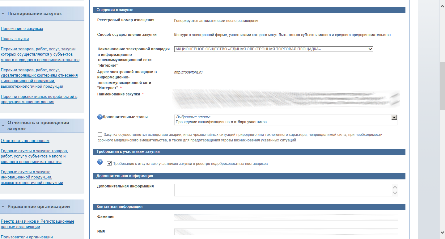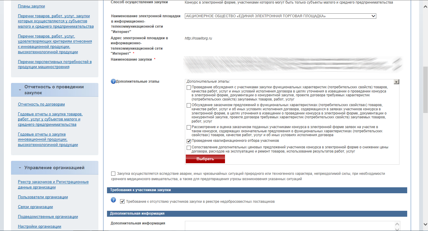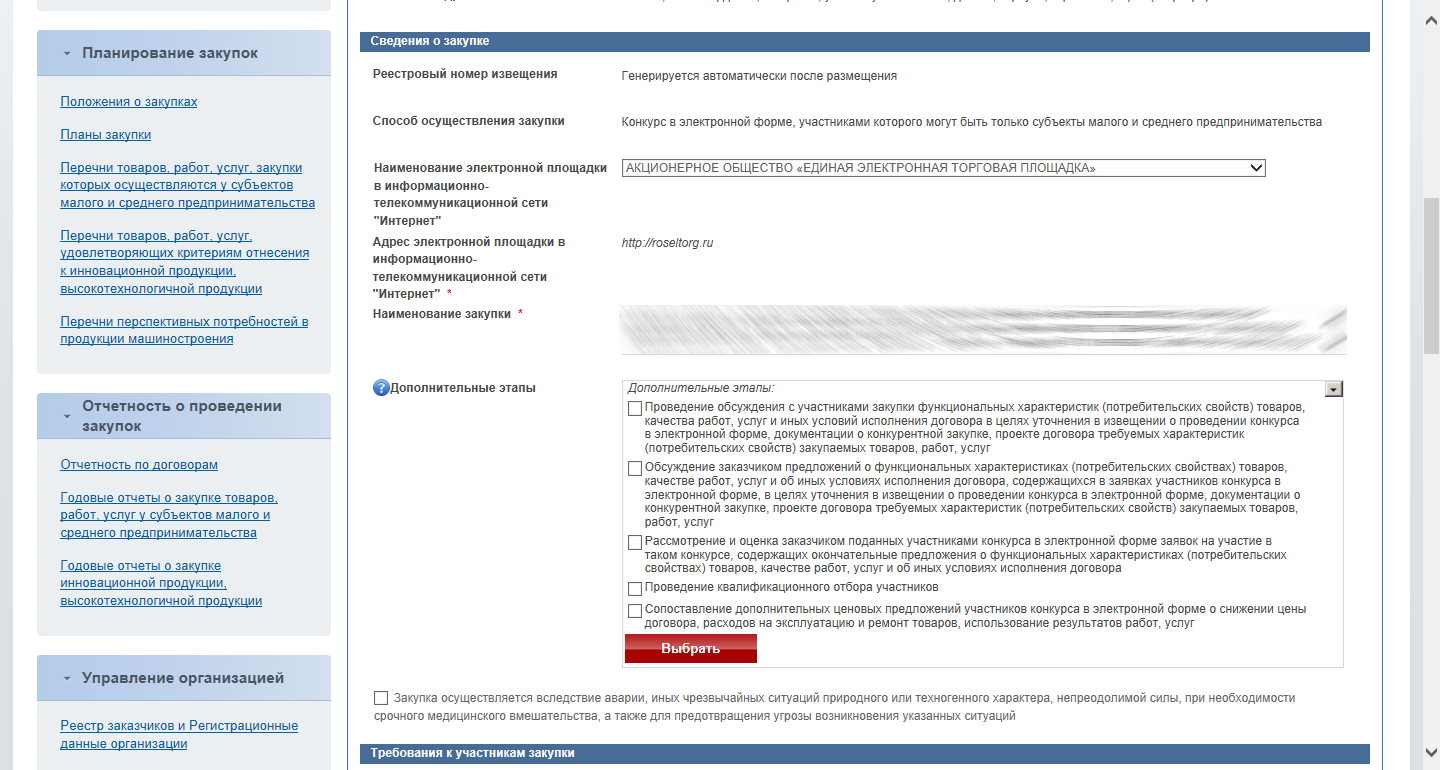 Суть - При размещении Конкурса в электронной форме, участниками которого могут быть только субъекты малого и среднего предпринимательства при выборе дополнительных этапов невозможно их выбрать и сохранить. Было испробовано на нескольких машинах - результат такой-же. В поддержку было написано ещё в начале недели. К сожалению интеграцию с ЭТП провести не можем - слишком тяжелые файлы.
