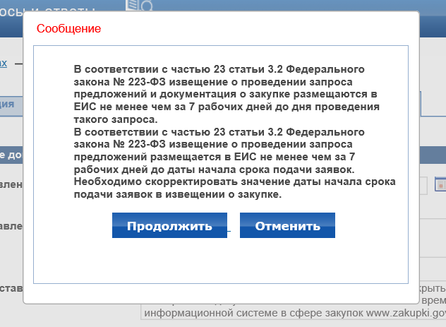 В соответствии с частью 23 статьи 3.2 Федерального закона № 223-ФЗ извещение о проведении запроса предложений размещается в ЕИС не менее чем за 7 рабочих дней до даты начала срока подачи заявок. Необходимо скорректировать значение даты начала срока подачи заявок в извещении о закупке.