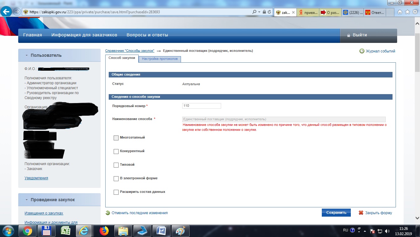 Мы бюджетное учреждение, подчиняемся Департаменту. На основании их Типового положения о закупках, разместили свое положение. В положении говорится, что оформление протоколов у единственного поставщика не требуется. Затем разместили закупку у единственного поставщика на вывоз мусора, перевели данную закупку на этап работы комиссии. И чтобы данную закупку завершить требуется подвесить протокол. Но во вкладке протоколы требуется выбрать "Выберите тип протокола для иного типа закупки" и при нажатии на галочку ничего не выдает. Хотя для данного вида закупки создан протокол в справочниках.