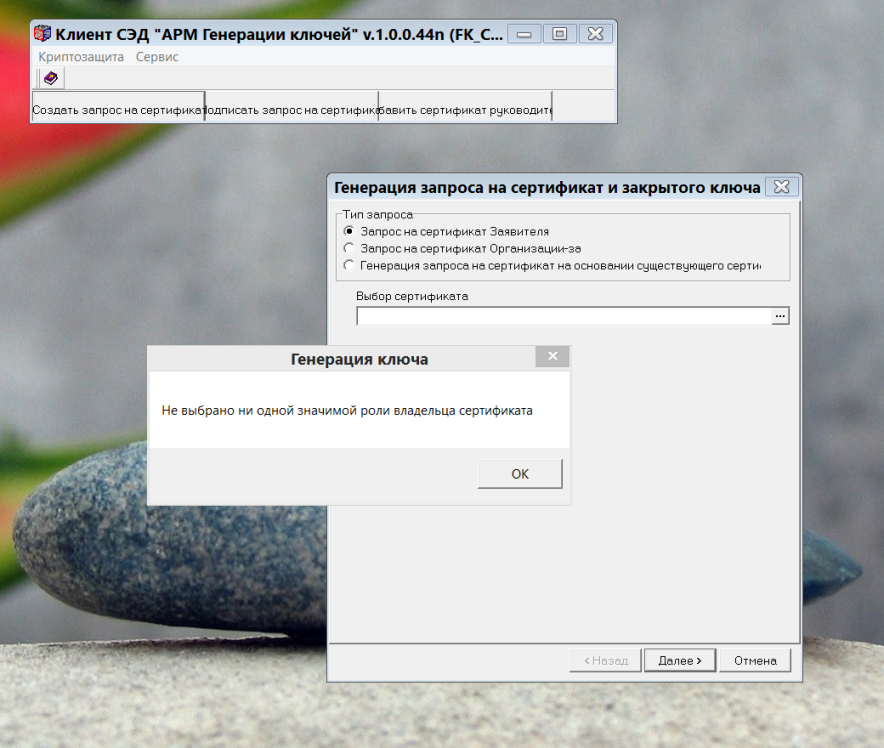 Помогите решить проблему. Сами не сильны в компьютерах, иногда помогает программист. Но его сейчас нет(((. На Windows 8 установили АРМ генератор ключей версии 1.0.0.44n. Крипто Про 4.0. Нужно сформировать заявку на смену эл. подписи, но при выборе Запрос на сертификат Заявителя выдает ошибку: не выбрано ни одной значимой роли владельца сертификата 1.0.0.44. Как нам быть????
