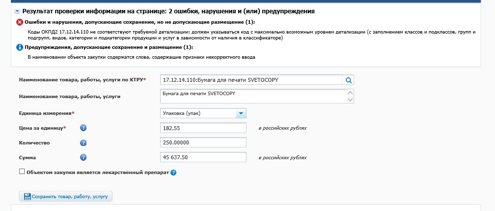 Ошибка: Коды ОКПД2 17.12.14.110 не соответствуют требуемой детализации: должен указываться код с максимально возможным уровнем детализации (с заполнением классов и подклассов, групп и подгрупп, видов, категории и подкатегории продукции и услуг в зависимости от наличия в классификаторе)