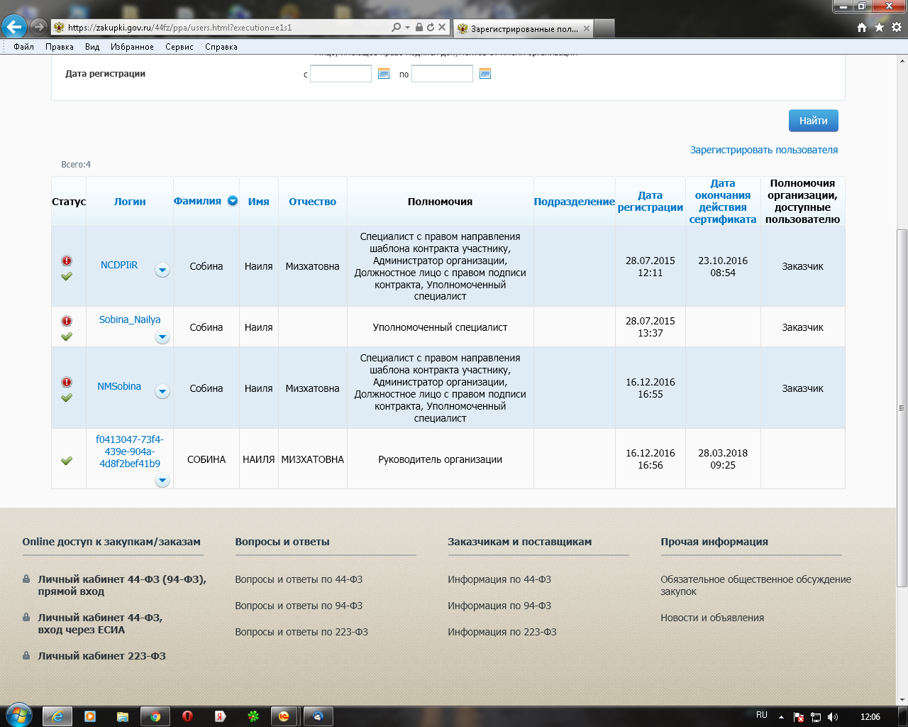 Наконец-то получилось зайти в ЛК! (пришлось получать новую ЭЦП с ИНН руководителя). Помогите, пожалуйста, что делать дальше? Нужно ли перерегистрировать пользователей NCDPIiR, Sobina_Nailya, NMSobina, если сертификатов на них нету, а по сути пользователь у нас один (с абракадаброй в логине и ролью "Руководитель"). Или нужно только добавить права руководителю, а тех пользователей не трогать?