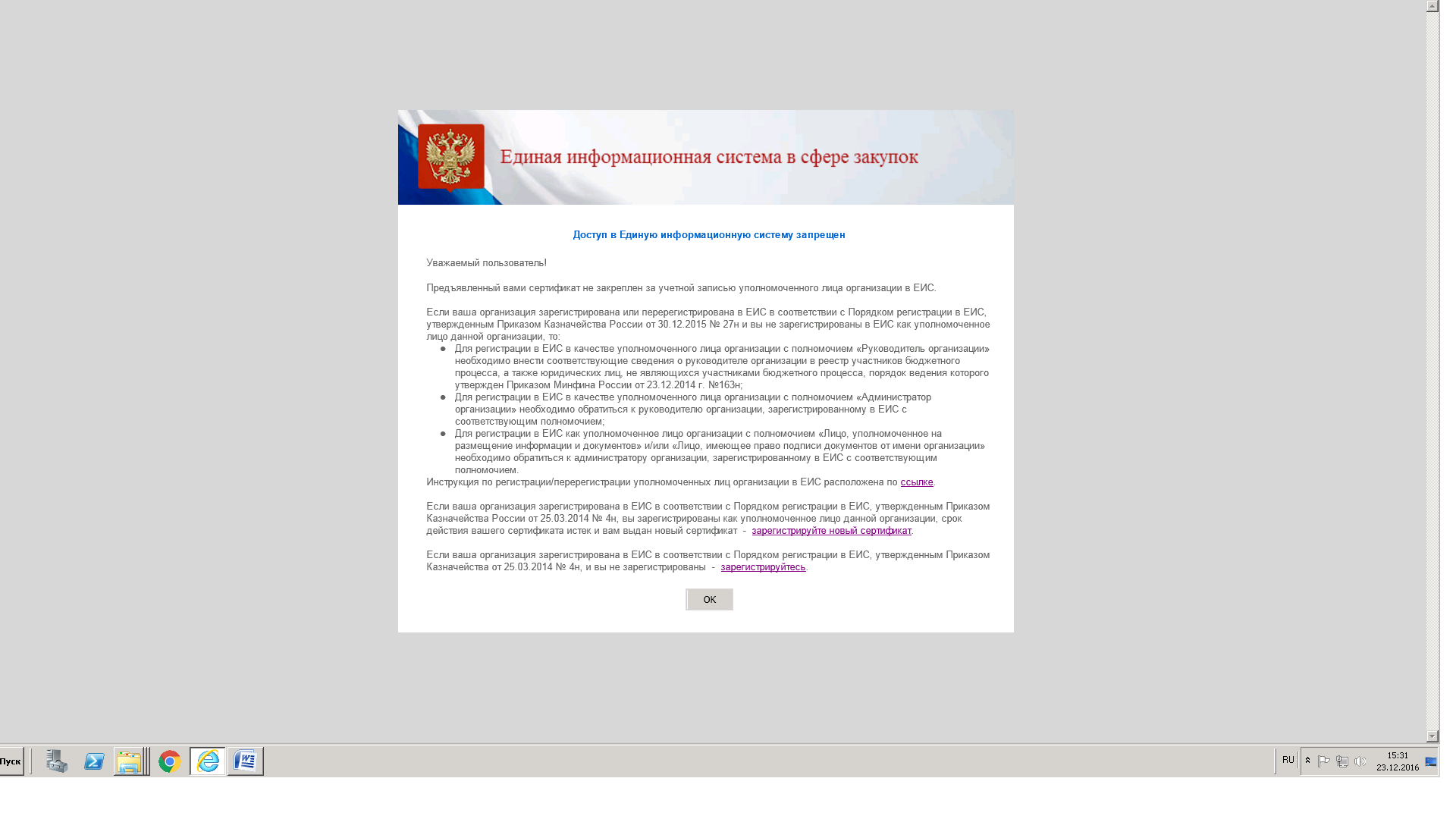 У меня тоже такая проблема: Изначально выскакивало окошко, где было "пройти перерегистрацию,.....нажмите да", нажимала, пишет все хорошо перерегистрировано. Потом сказали нужно открепить сертификат, но он у нас один-открепили, теперь в ЛК не могу попасть. Выскакивает окошко " зарегистрировать новый сертификат или регистрация" если выбираешь 1-логин и пароль, который соответственно никто не помнит(уже 3 бухгалтера сменилось), если выбираешь 2- пишет надо зайти с руководителя или администратора, хотя ключ один и в полномочиях прописано: "Администратор, уполномоченный специалист, должностное лицо......" Но он его не определяет, получилось несколько раз дозвониться по номеру 8 4951344124, говорят пишите форму-запрос на helpdesk@zakupki.gov.ru -отправила 19 декабря, 21 декабря, и сегодня ответа нет, к тому же два дня вообще не могу дозвониться -ждешь...ждешь.. а потом "все операторы заняты, перезвоните позднее". Кто писал форму-запрос и кому ответили на письмо? даже не приходит подтверждение, что они его получили