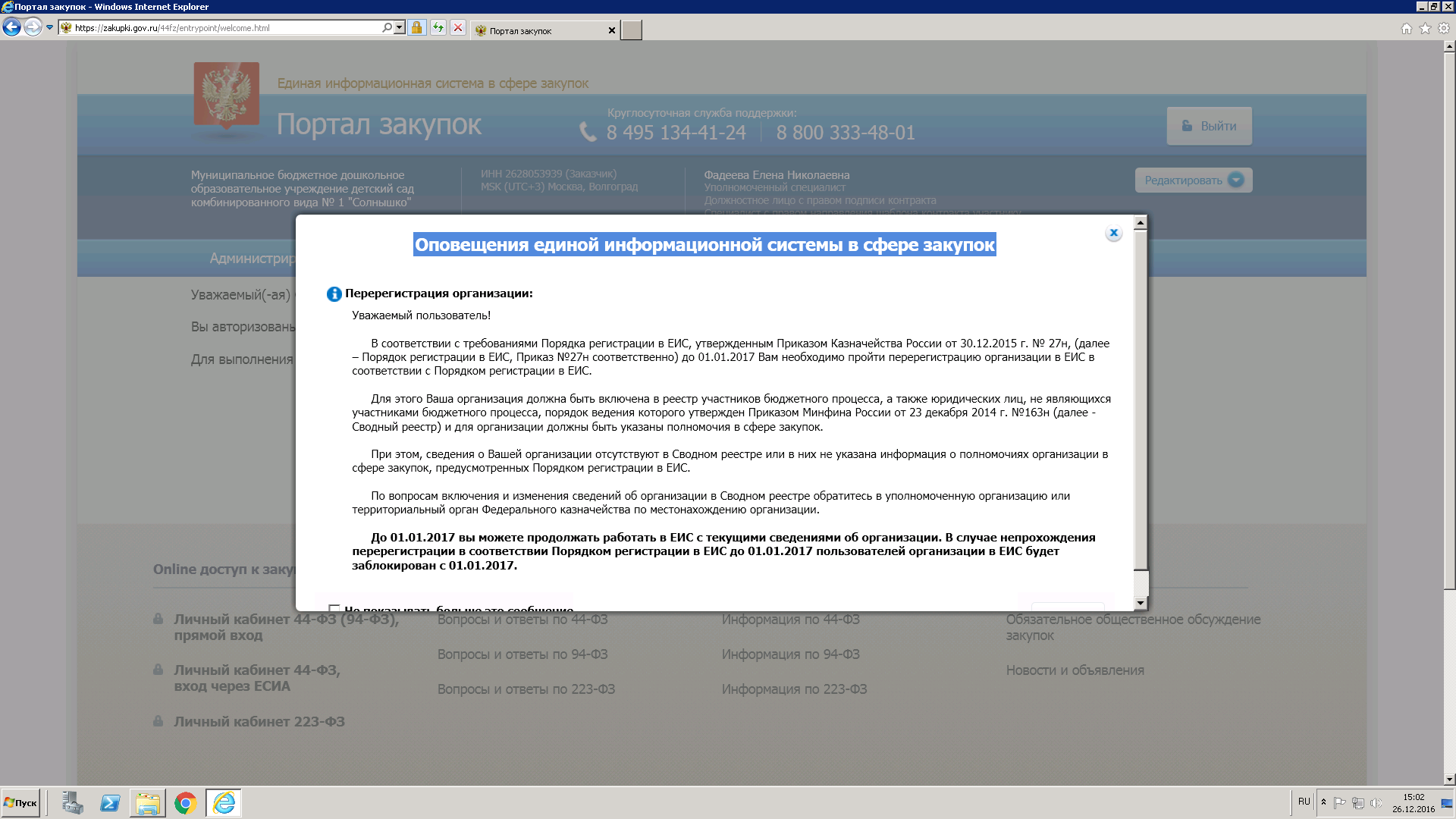 И еще одна проблема..мы не можем перерегистрировать все сады нашего города, именно организацию..не выдает окно для перерегистрации..вопрос очень острый!!организаций много,служба поддержки молчит !!! при входи в лс, выдает окно(скрин)...