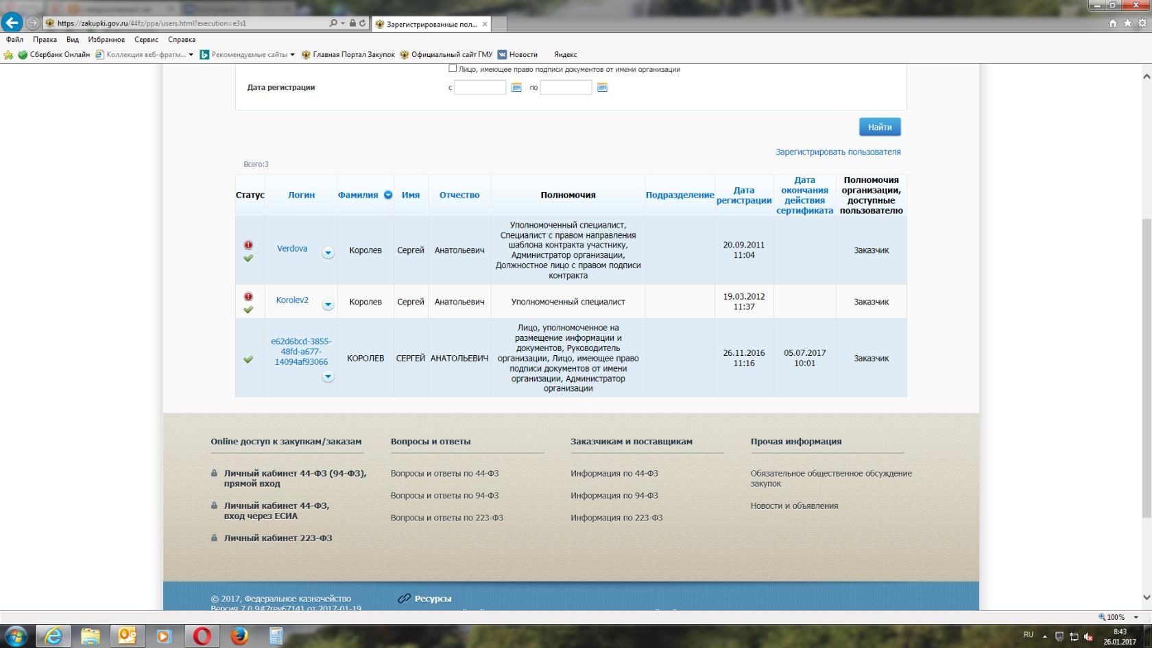 Подскажите, что за фигня происходит со списком пользователей. У нас на сайте закупок был один пользователь - директор, он же уполномоченный специалист и т.п. После начала перерегистрации пользователей, отвязали сертификат и зашли под ним в личный кабинет (все по инструкции). Но в списке пользователей теперь ТРИ директора! Подпись привязана к тому, у которого логин сформирован системой при перерегистрации. Реальный пользователь korolev2 остался без сертификата. И в журнале событий нет записи о том, что пользователь korolev2 прошел перерегистрацию. Для чего создан этот пользователь с непонятным логином и как его удалить?