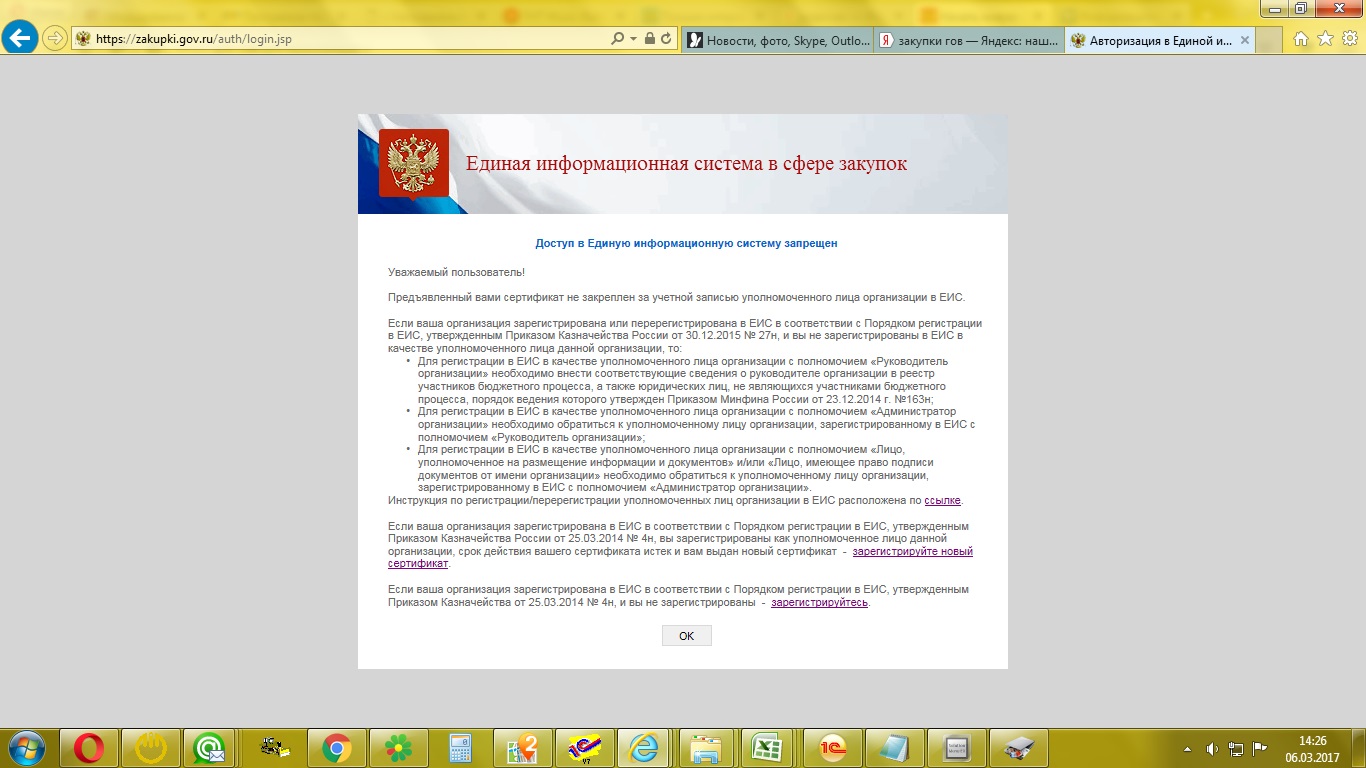 Я совсем новичок...Рабочее место настроил по инструкции, вроде все вышло верно. При попытки входа в личный кабинет (для первоначальной регистрации) появляется окно: "Доступ в Единую информационную систему запрещен. Уважаемый пользователь! Предъявленный вами сертификат не закреплен за учетной записью уполномоченного лица организации в ЕИС."