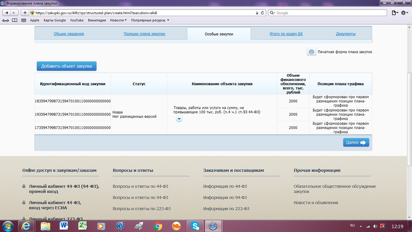 Spring_love писал(а):Сделала,к сожалению, выдает ошибку: Номер закупки, включенной в план закупок, не уникален для следующих позиций: ИКЗ: 173665201684766520100110020000000244, объект(ы) закупки: Товары, работы или услуги на сумму, не превышающие 100 тыс. руб. (п.4 ч.1 ст.93 44-ФЗ)
