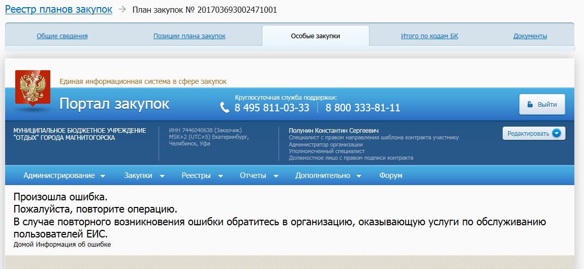 "Произошла ошибка.Пожалуйста, повторите операцию. В случае повторного возникновения ошибки обратитесь в организацию, оказывающую услуги по обслуживанию пользователей ЕИС.".