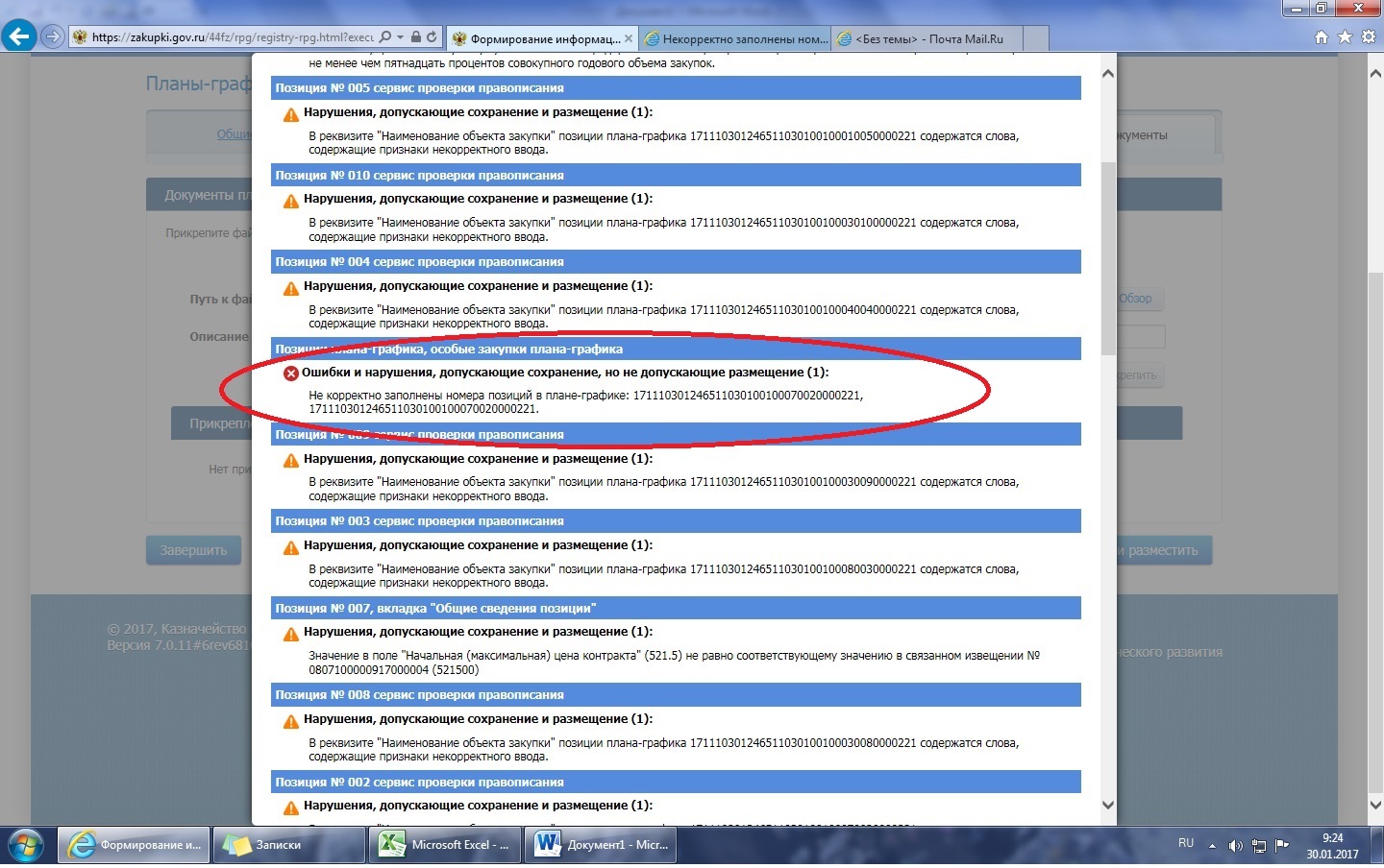 И получается позиции отменили 23.01 - потом 24.01 прошел первый контроль без ошибок. 25.01 внесли плюс позицию - он вернулся с контроля без ошибок... и ВСЕ - после 25 просто чисто формально ничего не трогая не в позициях не в особых закупках - меняю фамилию ответственного за ПГ - и всплывает такая ошибка!!