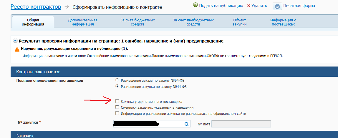 AFil писал(а):Доброго дня! Уважаемые форумчане, прошу ответа на несколько несложных вопросов. Заношу информацию о контракте в реестр контрактов. Аукцион признан несостоявшимся (подана одна заявка), заключили контракт по п.25 ч.1 ст 93, а вопрос заключается вот в чем, ставить ли галочку "закупка у единственного поставщика" на вкладке "общая информация"? (Рисунок 1 во вложении). (Согласен глупый вопрос, но все же)) И еще, на вкладке "за счет бюджетных средств" сумма контракта какой месяц указывать (Рисунок 2 во вложении), если контракт заключили в июле, а работы должны быть выполнены до 1 октября. Спасибо
