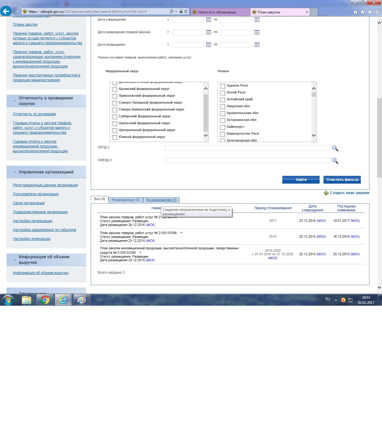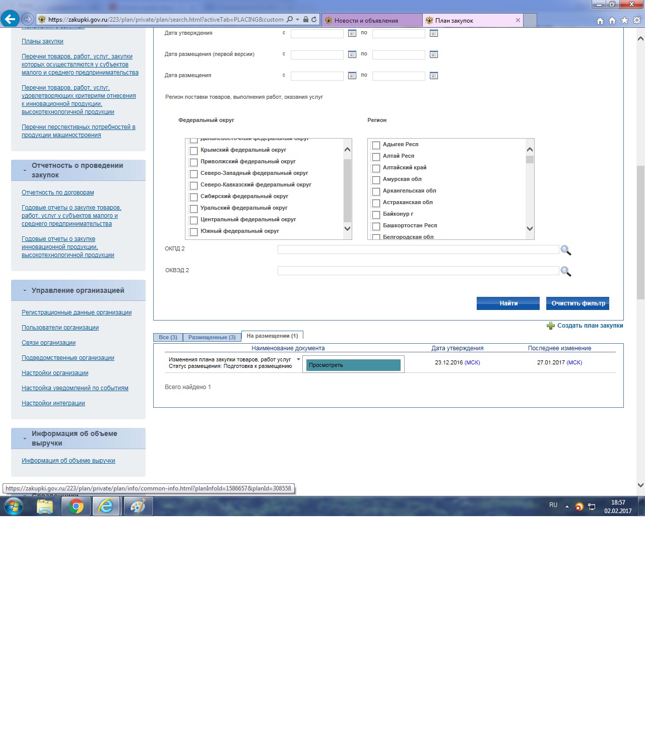 Что надо указать в плане закупок, чтоб он разместился?