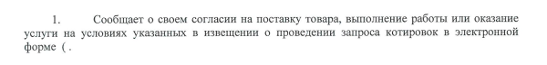 Должно быть" 1. Сообщает о своем согласии на поставку товара, выполнение работы или оказание услуги на условиях указанных в извещении о проведении запроса котировок в электронной форме (номер извещения:___________________, наименование закупки), на условиях, предусмотренных извещением и проектом договора."