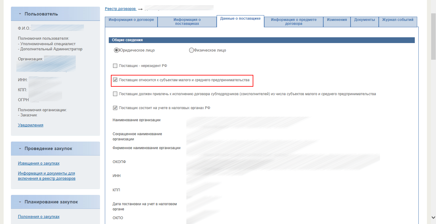 monpk_zak писал(а):А уточните, пожалуйста, где сама фраза "Значение признака отличается от установленного в лоте извещения" в просмотре договора устанавливать галочку нужно про СМП? Первый раз сегодня столкнулась, хотя закупку проводили без ограничения и в принципе на нас не распространяется обязанность по закупке у СМП.