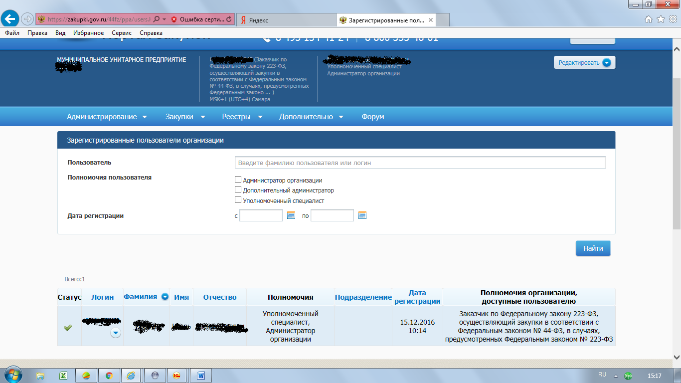 Diego писал(а):Помогите настроить ЛК по 44-фз, никак не могу разобраться. Сегодня получил сертификат поместил его в контейнер и авторизовался в ЛК по 44-фз, потом зашел в Администрирование и добавил права пользователю, но в лк ничего не изменилось добавился только реестр по 44-фз. Не пойму как план создавать , извещение и т.п. , что я еще должен сделать подскажите.