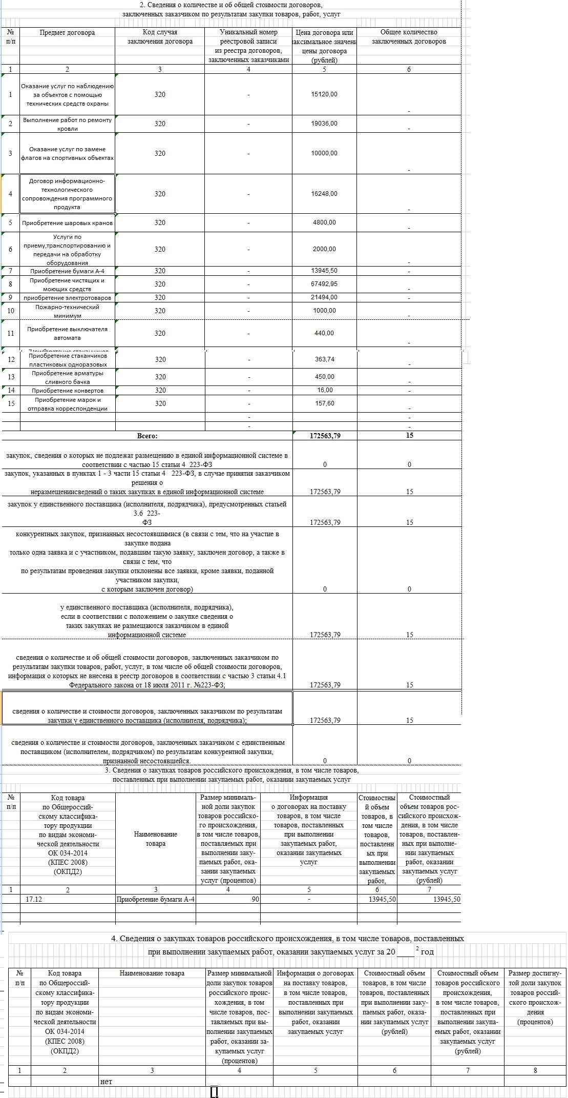 Я Все оплаты товаров с одним ОКПД2 в третей вкладке по разным неразмещаемым договорам (они все до 100 тр) суммировала и записала одной строкой .